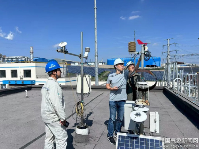 2024年9月12日,陕西省大气探测技术保障中心联合榆林市气象局对榆林光伏企业气象探测设备开展现场计量工作陕西省气象局供图