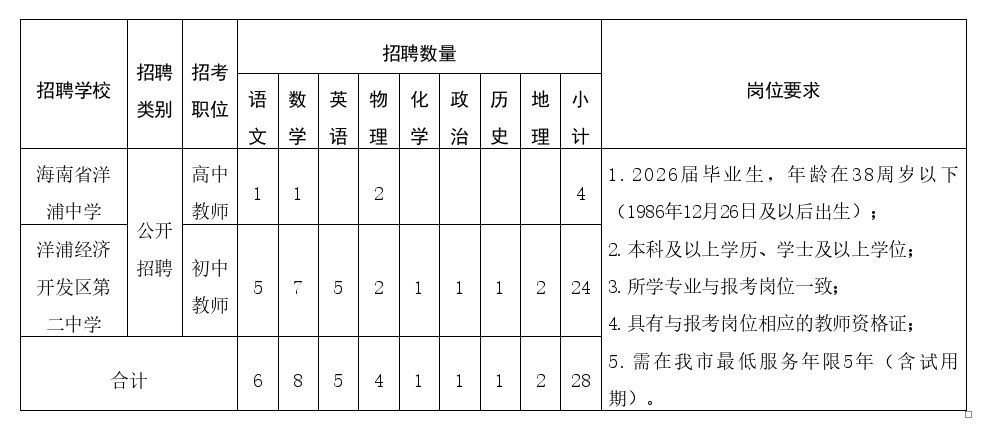 本次招聘岗位由海南省洋浦中学和洋浦经济开发区第二中学提供,共设中学教师职位40个,其中高中教师7名、初中教师33名,涵盖语文、数学、英语等学科领域。招聘对象为符合岗位条件的高校应届毕业生及优秀在职教师,年龄原则上不超过38周岁(1986年12月26日及以后出生)。
